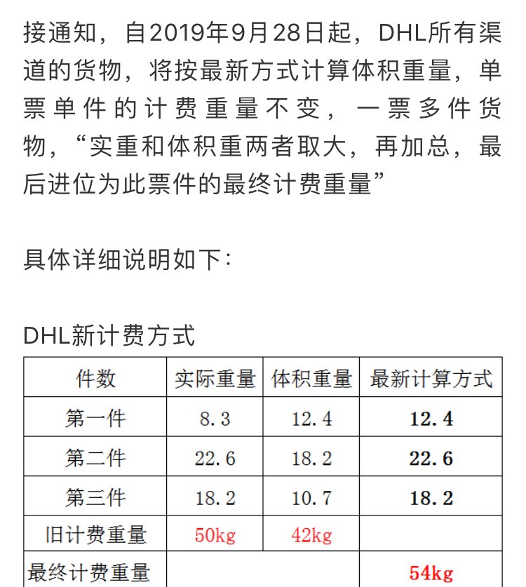 DHL最新体积计费重量更换通知